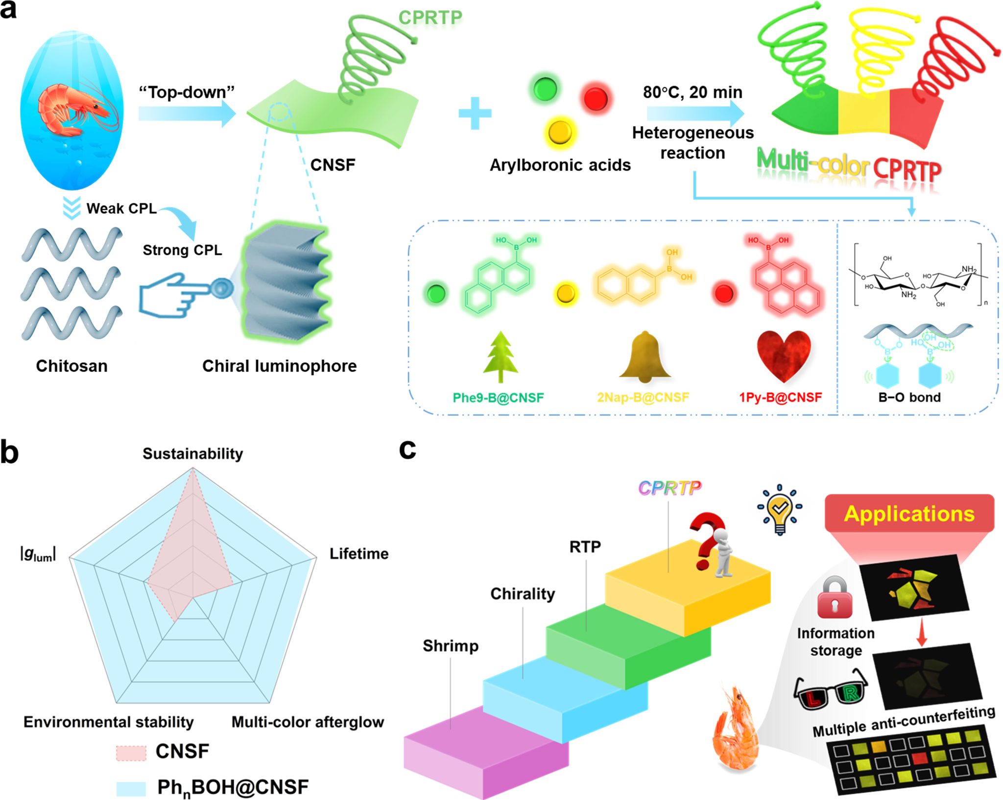 In this work, we propose a simple and versatile molecular engineering strategy to anchor arylboronic acid chromophores onto shrimp-shell-derived nanostructured chitosan films via B−O covalent bonds (Figure 1). The synergistic rigidification effect of B−O covalent bonds and hydrogen bonds stabilizes triplet excitons and suppresses nonradiative decay, while the material's intrinsic chiral nematic phase structure preserves circular polarization properties. The resulting composite films exhibit tunable right-handed circularly polarized triphosphorescence (CPRTP) emission (covering green, yellow, and red) at room temperature, featuring ultra-long phosphorescence lifetimes (419–805 ms) and high asymmetry factors (up to −0.29). Furthermore, comparative analysis with other advanced CPRTP systems highlights the exceptional performance advantages of this photonic platform based on shrimp-shell-derived chitosan. Its synergistic properties—multicolor emission, ultra-long phosphorescence lifetime, and high asymmetry factor—fully demonstrate the immense potential of such sustainable materials for practical CPRTP applications.