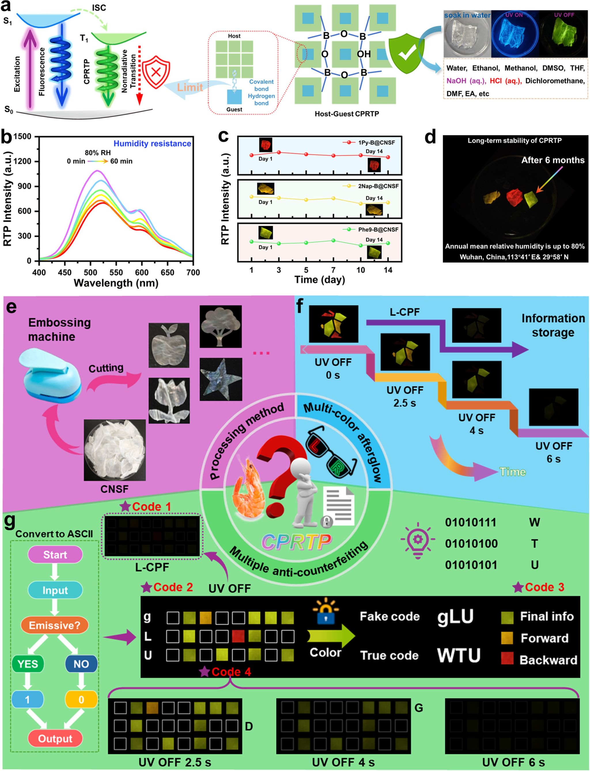 Particularly noteworthy is that even after prolonged immersion in harsh hydrophilic environments such as acidic, alkaline, or saline solutions, or exposure to various organic solvents, this composite film exhibits no significant quenching. It maintains excellent stability for up to six months while retaining outstanding flexibility and convenient processability. Leveraging these unique advantages, we have successfully developed a multi-level anti-counterfeiting encryption system based on QR codes and binary encoding. This system leverages multiple optical “codes” inherent to the material—including fluorescence, long-lived phosphorescence, circular polarization properties, and time-dependent afterglow—to achieve high-security information encryption (Figure 2). This research not only pioneers a novel pathway for high-value utilization of shrimp shell waste but also fully demonstrates the resource value of biomass-based CPRTP materials, laying the foundation for their further application in chiral photonic devices and related fields.