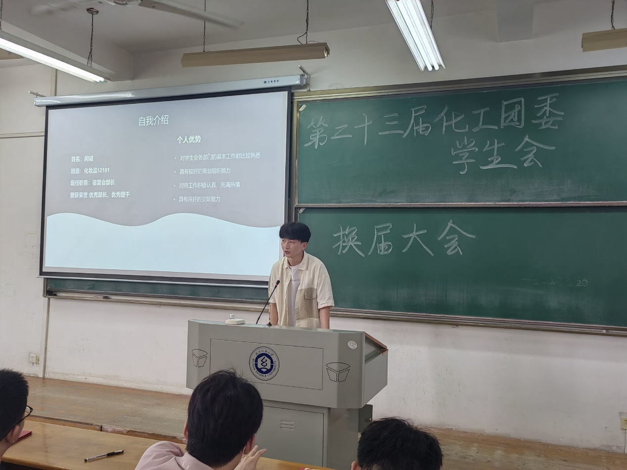 5月20日下午,武汉纺织大学化学与化工学院第三次学生代表大会暨第二十三届主席团换届大会在崇志楼218教室顺利召开。院团委学生会指导老师雍诚、院团委学生会主要学生干部以及各班学生代表出席本次大会。