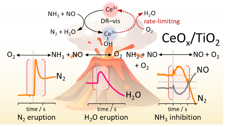 在NH3–SCR NO反应中,关于“催化反应的决速步骤”长期存在争议。围绕这一关键科学问题,研究团队构建了高度分散的Ce/TiO2催化剂体系,并结合瞬态反应、在线质谱及operando DR-vis光谱等手段,从动态角度解析了反应过程中Ce价态与反应速率之间的内在关联。