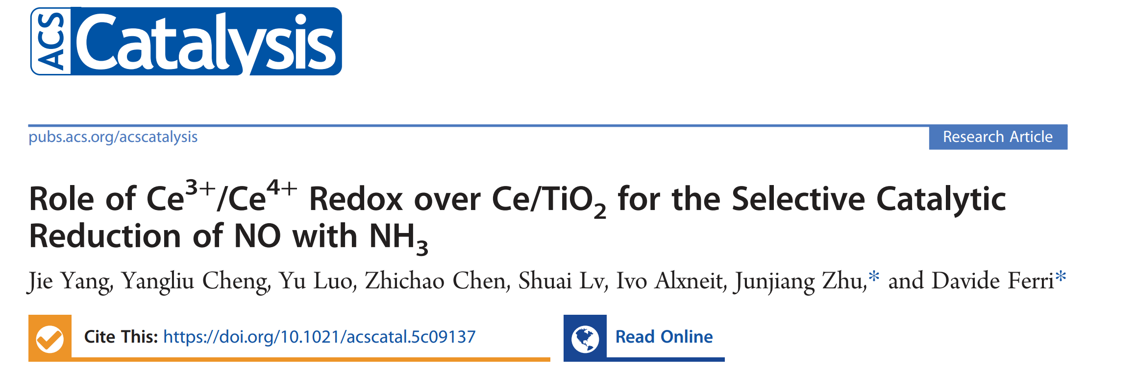 近日,武汉纺织大学化学与化工学院朱君江教授团队,联合瑞士保罗谢勒研究所(PSI)等单位,在NH3选择性催化还原NO(NH3-SCR NO)反应机理研究方面取得新进展,揭示了Ce基催化剂上NH3-SCR NO 反应的关键决速步骤。相关成果以“The Role of Ce3+/Ce4+ Redox over Ce/TiO2 for the Selective Catalytic Reduction of NO with NH3”为题发表于ACS Catalysis。武汉纺织大学为第一署名单位,团队青年教师阳杰博士为论文第一作者,朱君江教授和Davide Ferri博士为论文通讯作者。